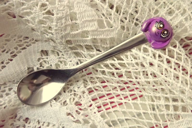 Lžička z Plzně je zdobená fialovým ručně modelovaným a malovaným králíčkem.